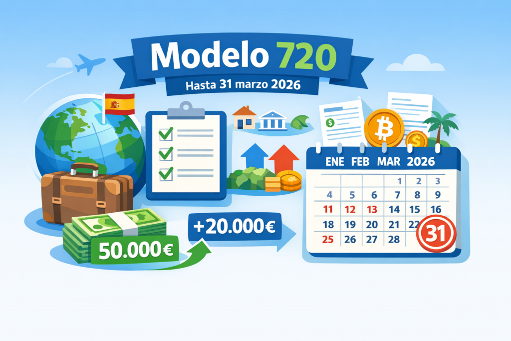 Y ojo con la confusión típica: las criptomonedas no van en el 720. Si tienes monedas virtuales en el extranjero, la obligación informativa es el Modelo 721, con el mismo calendario (1 de enero–31 de marzo del año siguiente).